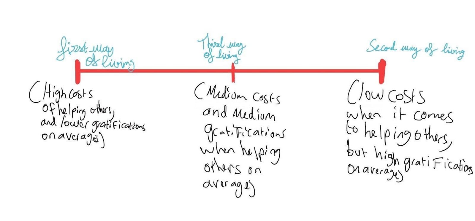 The third and final way of living is a mix of both “the first way of living” and “the second way of living”. This way of living highlights the people that have mixed/ more balanced values (say that “the first and second way of living” are two opposite ends on a spectrum, the third would lie in the middle, look at figure 1). They have lower costs than the people of “the first way of living” when it comes to helping others, but at the same time lower gratifications compared to “the second way of living”.